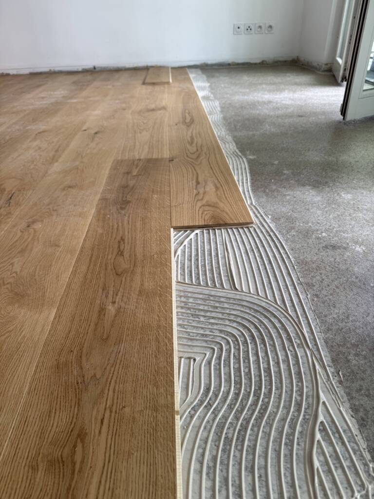 La pose collée assure une excellente tenue dans le temps et s’adapte à vos sols techniques (type plancher chauffant). Elle est recommandée pour les parquets contrecollés ou massifs de faible épaisseur.